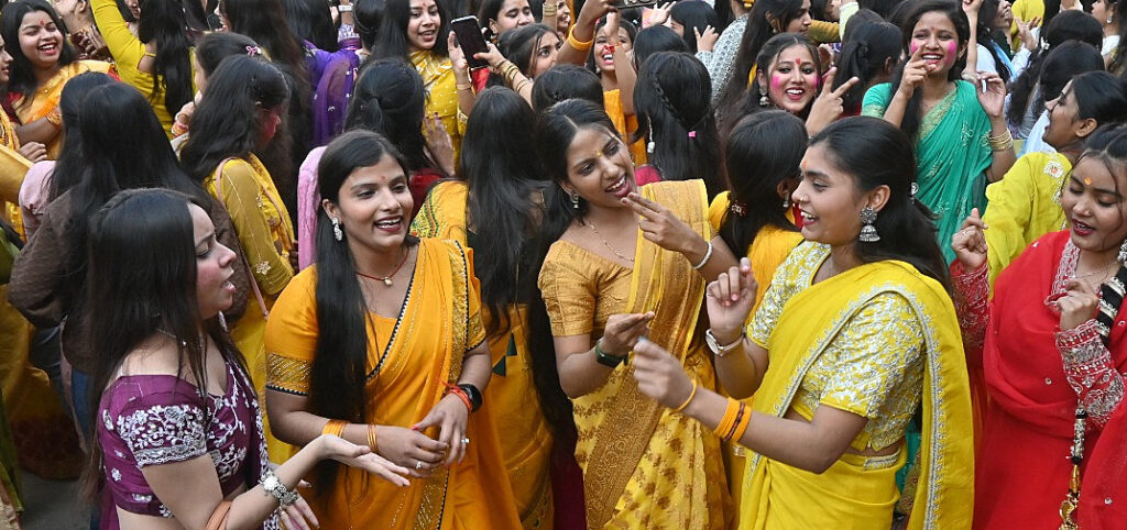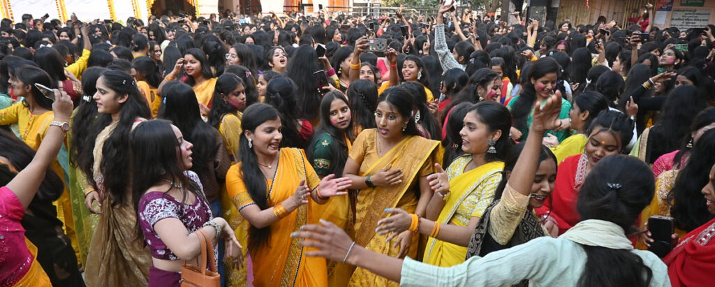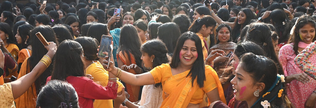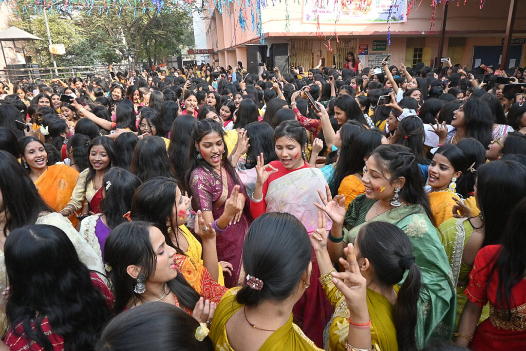 अरविंद महिला कॉलेज में सरस्वती पूजा का उल्लासपूर्ण आयोजन, बसंत पंचमी पर छात्राओं ने अबीर-गुलाल संग किया नृत्य