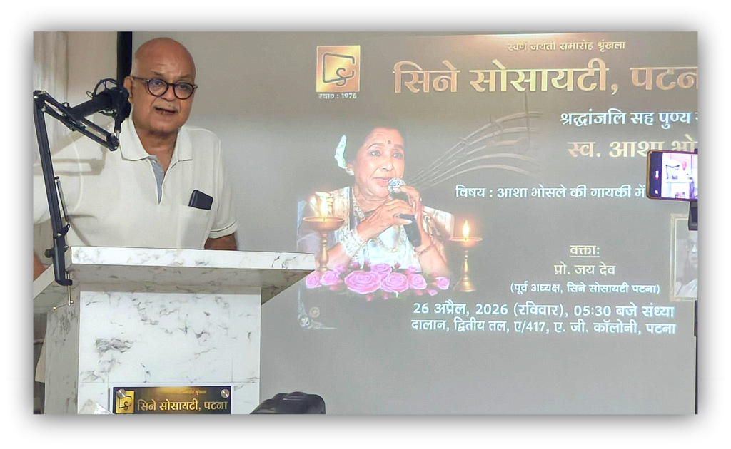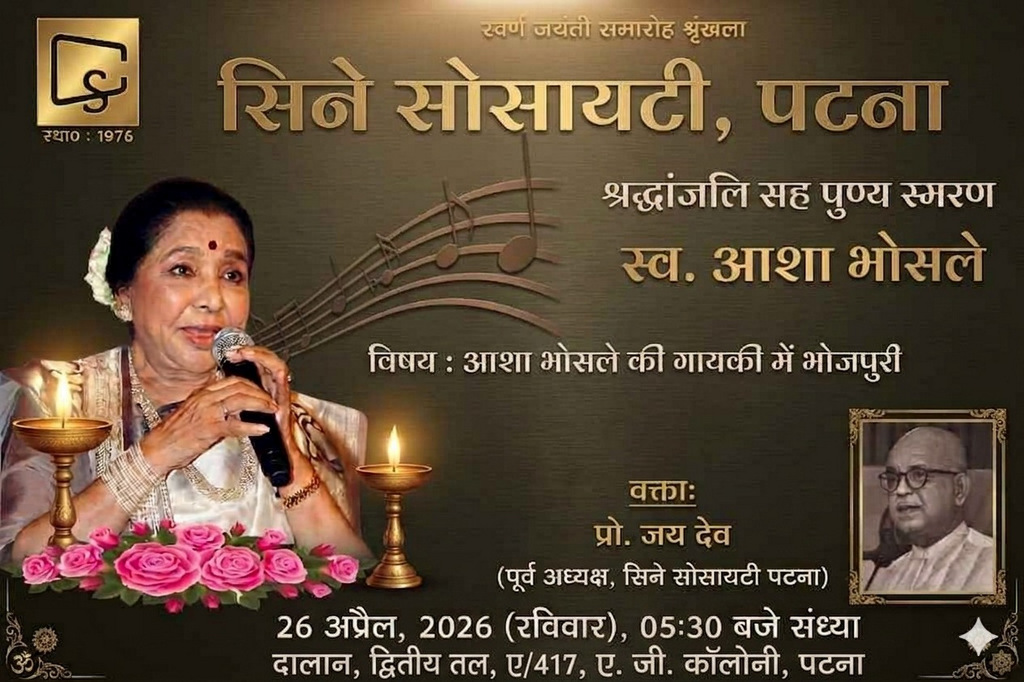 कार्यक्रम का मुख्य विषय “आशा भोसले की गायकी में भोजपुरी” रखा गया, जिसमें वक्ताओं ने उनके बहुआयामी संगीत सफर, विभिन्न भाषाओं में उनकी पकड़ और भोजपुरी संगीत पर उनके प्रभाव को रेखांकित किया।इस अवसर पर सिने सोसायटी, पटना के पूर्व अध्यक्ष प्रो. जय देव मुख्य वक्ता के रूप में उपस्थित रहे। उन्होंने अपने संबोधन में आशा भोसले की गायकी की विविधता, प्रयोगधर्मिता और भारतीय संगीत को समृद्ध करने में उनकी भूमिका पर प्रकाश डाला।यह कार्यक्रम रविवार, 26 अप्रैल 2026 को शाम 5:30 बजे ए/417, ए.जी. कॉलोनी स्थित ‘दालान’ सभागार (द्वितीय तल) में आयोजित किया गया। कार्यक्रम में शहर के संगीत प्रेमियों, कलाकारों और बुद्धिजीवियों की सक्रिय भागीदारी रही, जिससे आयोजन एक महत्वपूर्ण सांस्कृतिक संवाद के रूप में उभरा।