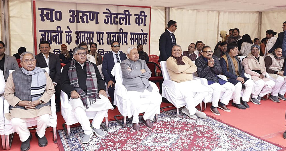 पूर्व केंद्रीय मंत्री स्वर्गीय अरुण जेटली की जयंती के अवसर पर रविवार को पटना के कंकड़बाग स्थित पीसी कॉलोनी के सेक्टर-4, पार्क संख्या–31 में राजकीय जयंती समारोह का आयोजन किया गया। समारोह में राज्य के मुख्यमंत्री नीतीश कुमार ने स्वर्गीय अरुण जेटली की प्रतिमा पर माल्यार्पण कर उन्हें भावभीनी श्रद्धांजलि अर्पित की।